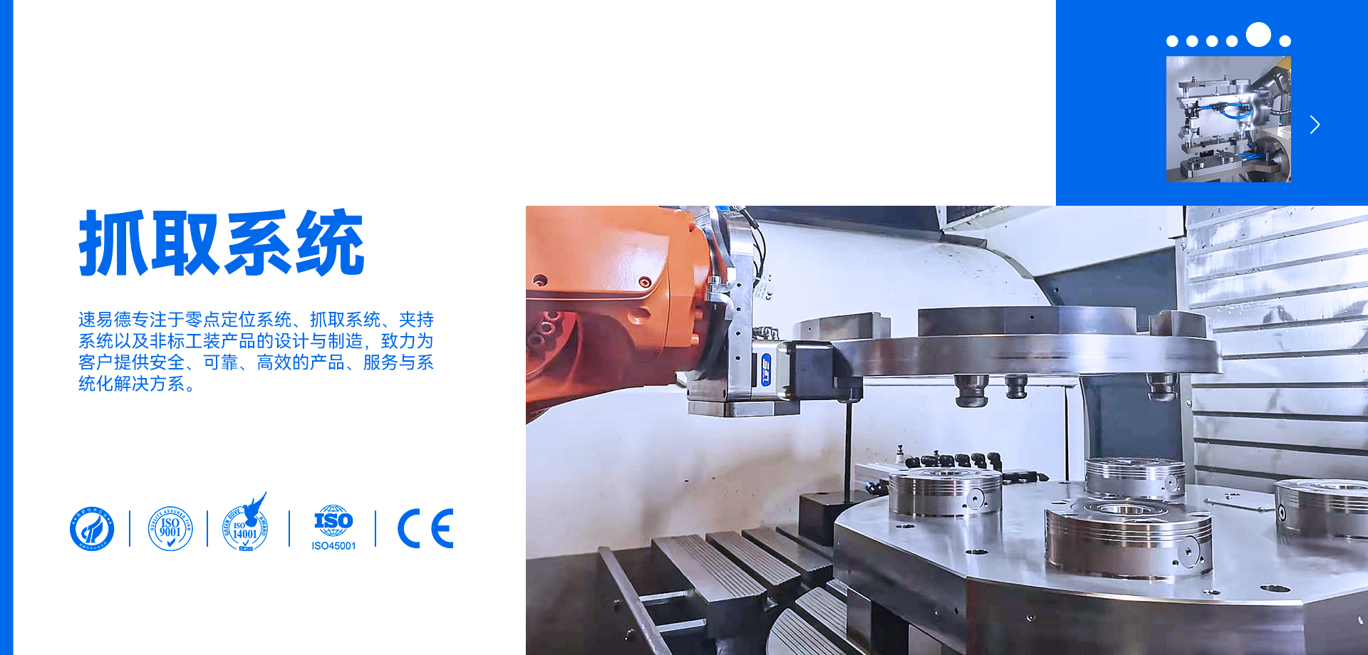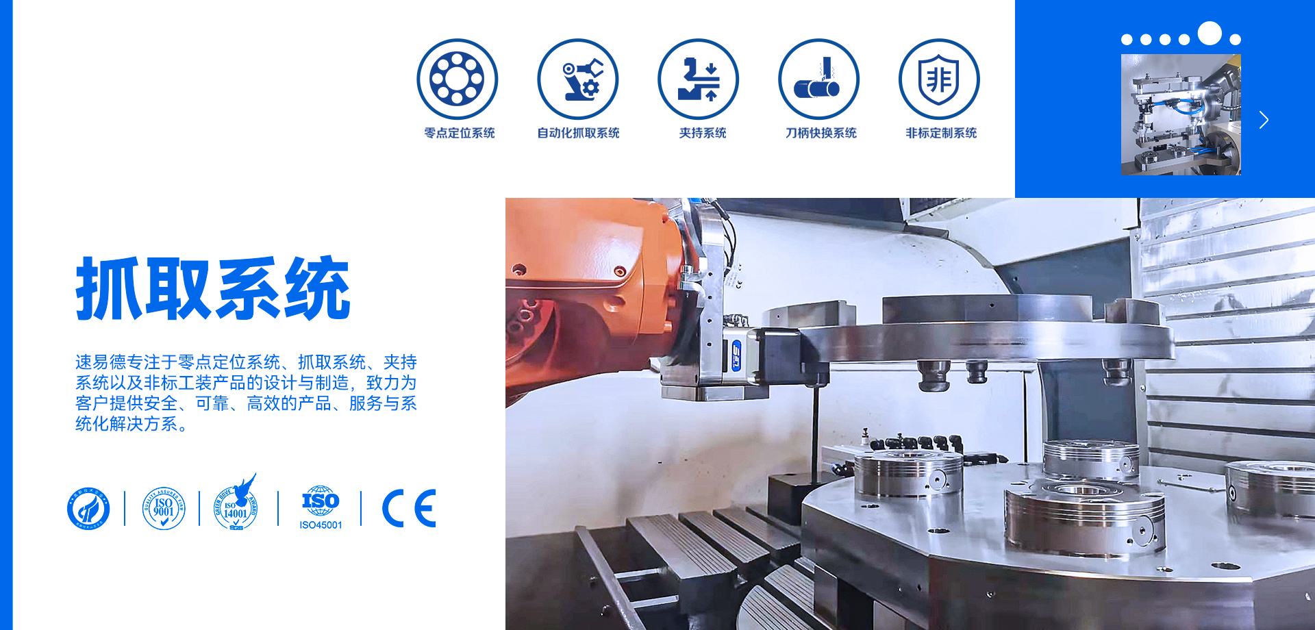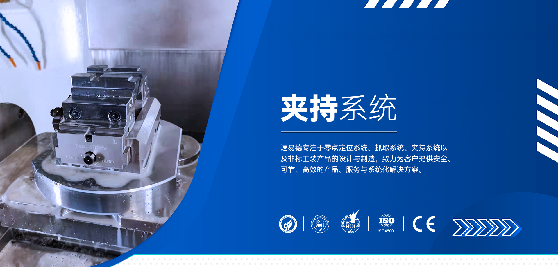 苏州速易德工业装备系统有限公司是一家集研发、设计、生产、销售、售后为一体的国家高新技术民营企业,专注于零点定位系统、抓取系统、夹持系统以及非标工装产品的设计与制造,致力为客户提供安全、可靠、高效的产品、服务与系统化解决方案。