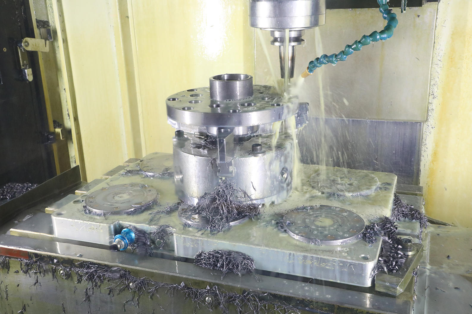 - 零点定位器基础板安装在CNC加工中心机床上;