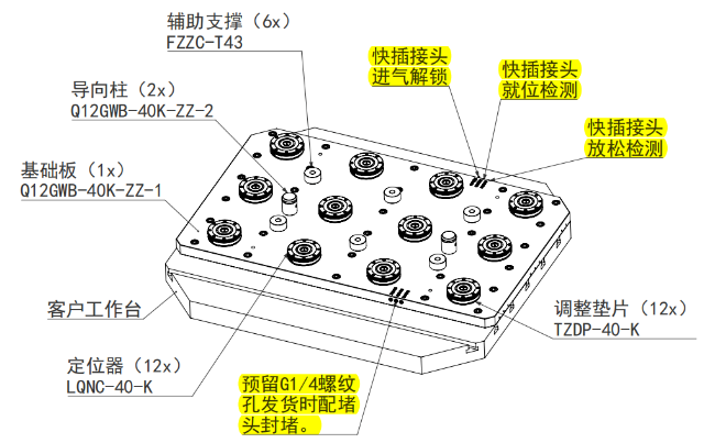 客户的工件是注塑机,属于大型件,在卧加工作台上进行加工,要实现多面加工,需要在零点定位系统上配套家具来装夹工件,对夹具要求满足多种加工状态,并且需要直观地看到托盘的夹紧和放松状态。
