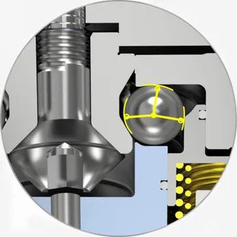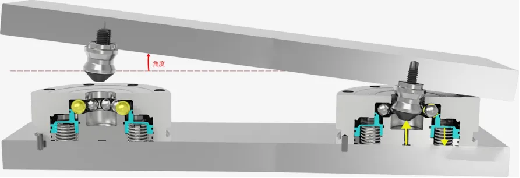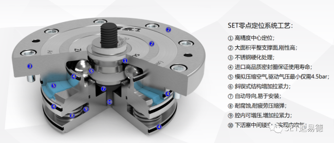 零点定位系统属于自锁结构,通气时打开,断气时锁定。当液压或气压进入零位定位系统时,压力将通过活塞压缩下方的弹簧,钢球将向两侧扩散。夹紧依靠内部强力弹簧,正常工作时不需要气源。