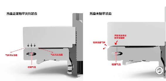 如图(2)所示,检测到的逸出气体会沿着间隙向外逸出,流量传感器判断流量差,从而实现夹紧检测。