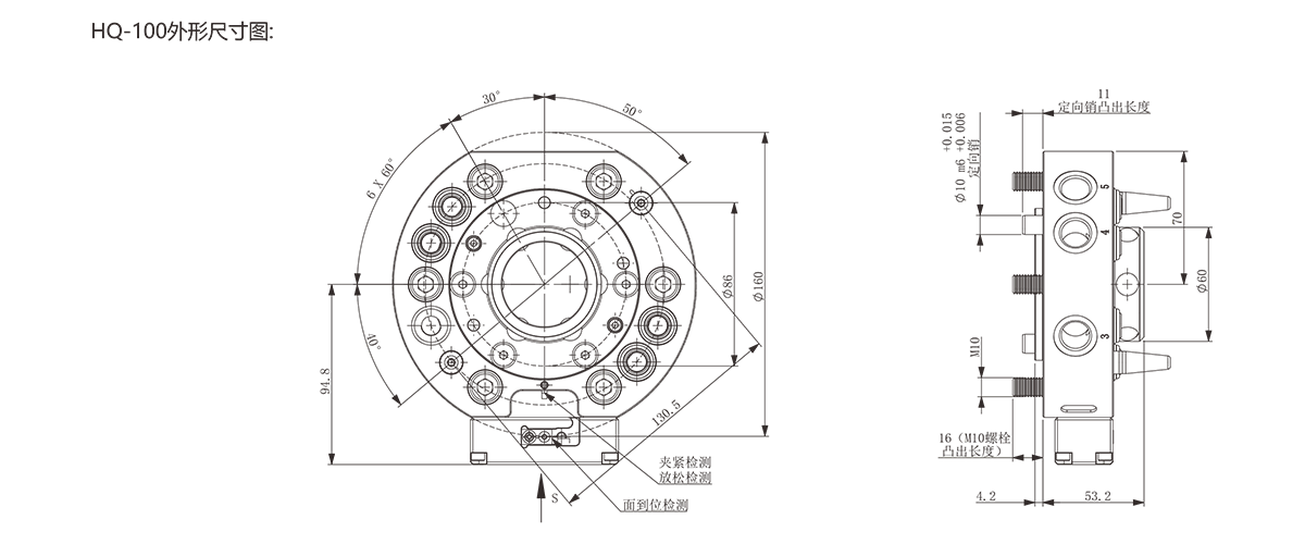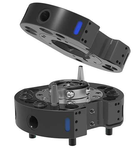 - 其重复定位精度≤±0.015mm,锁紧力为12000N。可承载100kg工件。多种动力、液体、气体模块可选配。设有专门的保险,防止意外断气的风险。