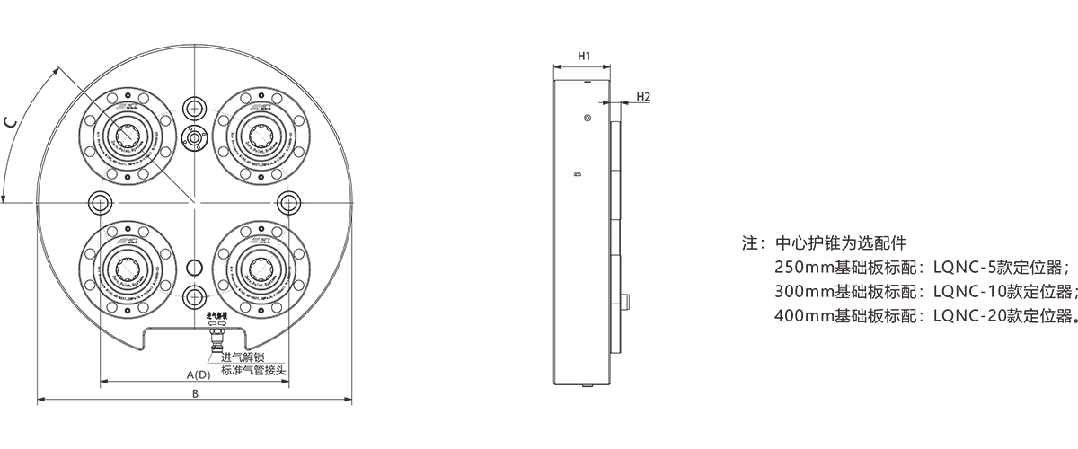 通过气压解锁弹簧机械锁紧重复定位精度<0.005mm,单个两单元零点定位器基础