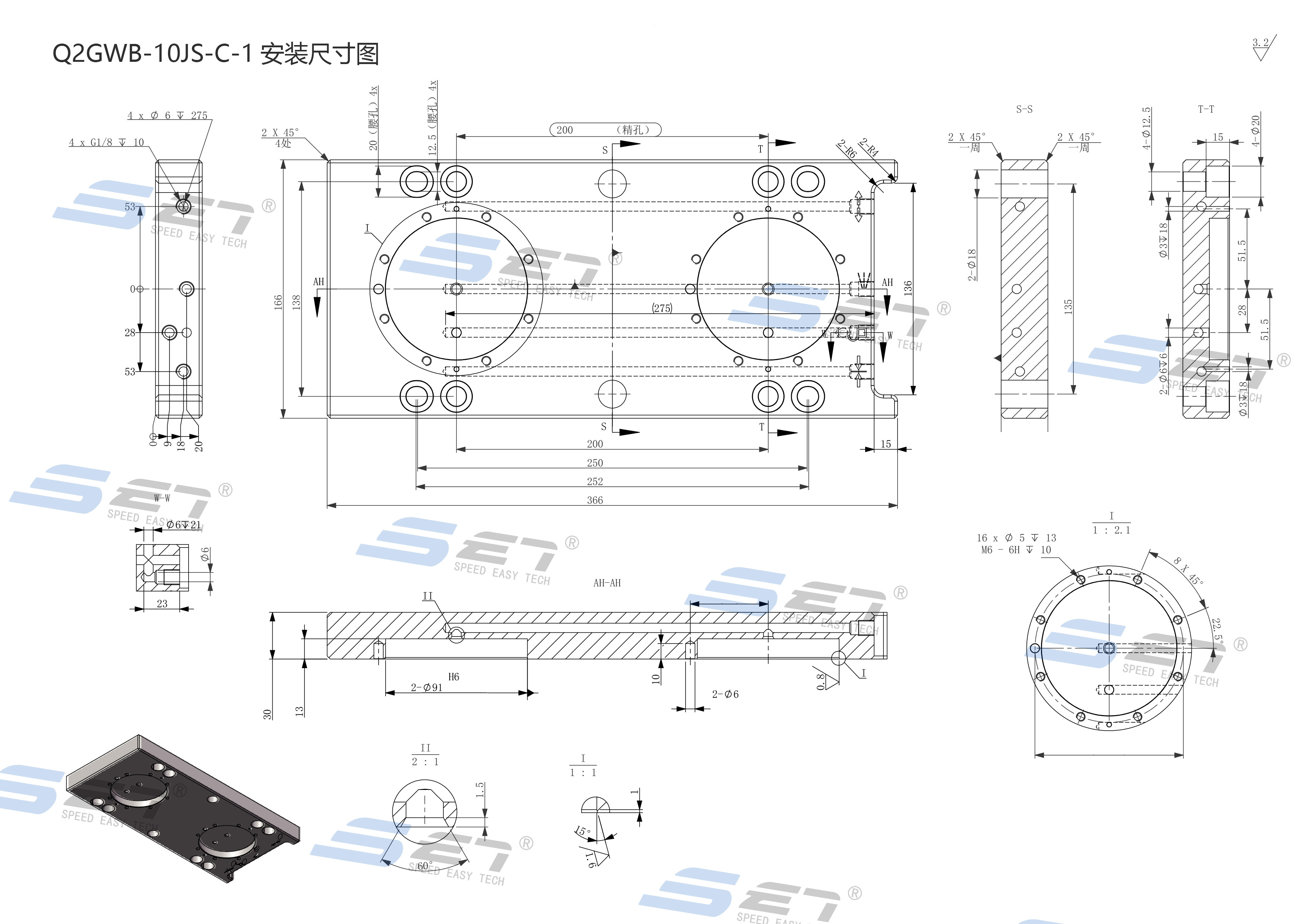 - 可通过基板上的沉头孔锁定在T型槽内,安装方便快捷,排气口安装消音器,防止异物进入。