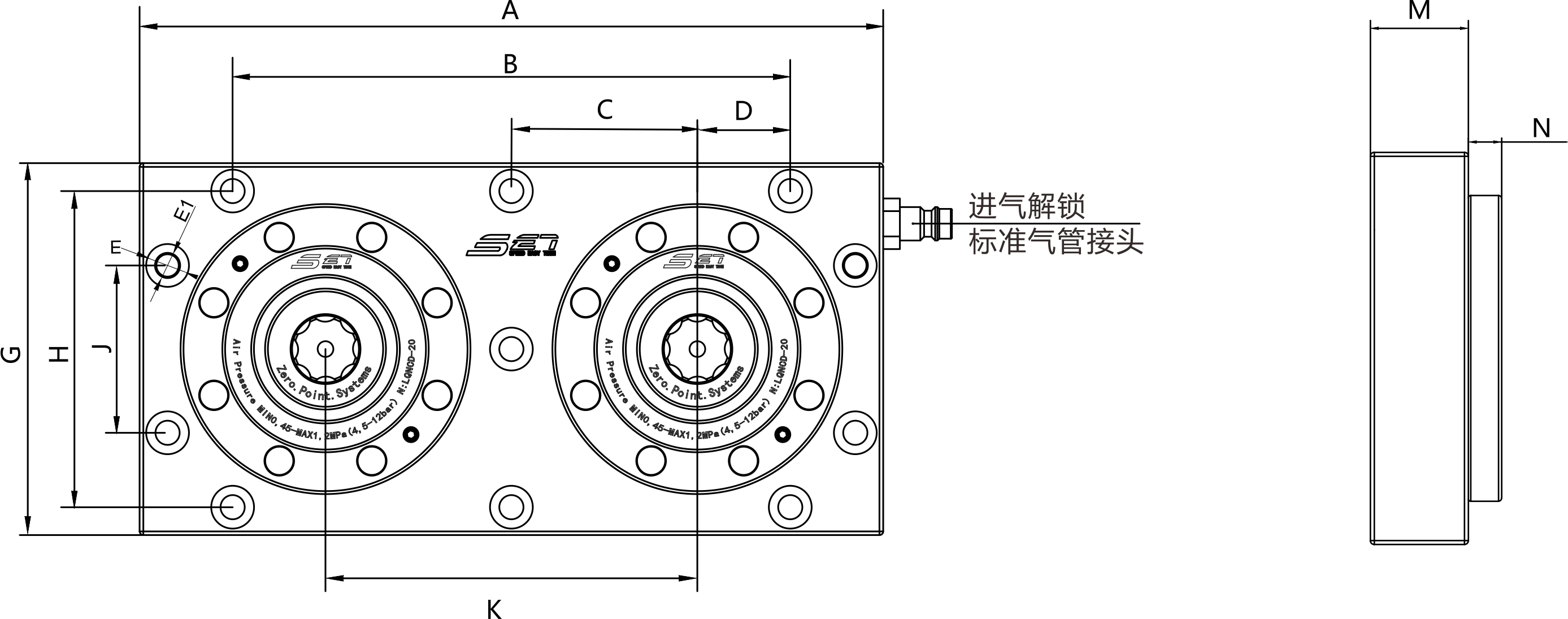 - 两单元零点定位器基础板长366mm、宽166mm、高40mm(含定位器),重12.6kg。可以通过气压和液压解锁,通过弹簧机械锁定。